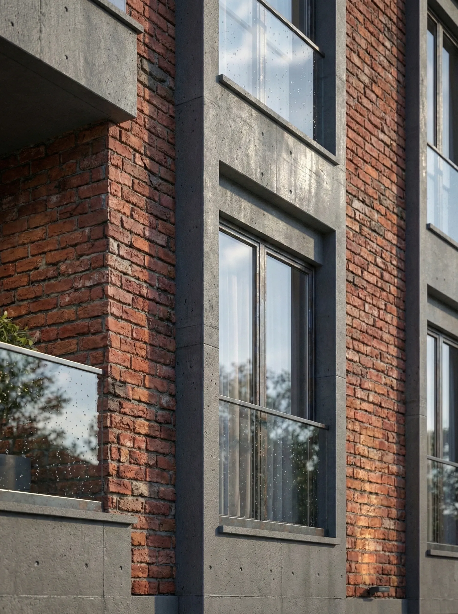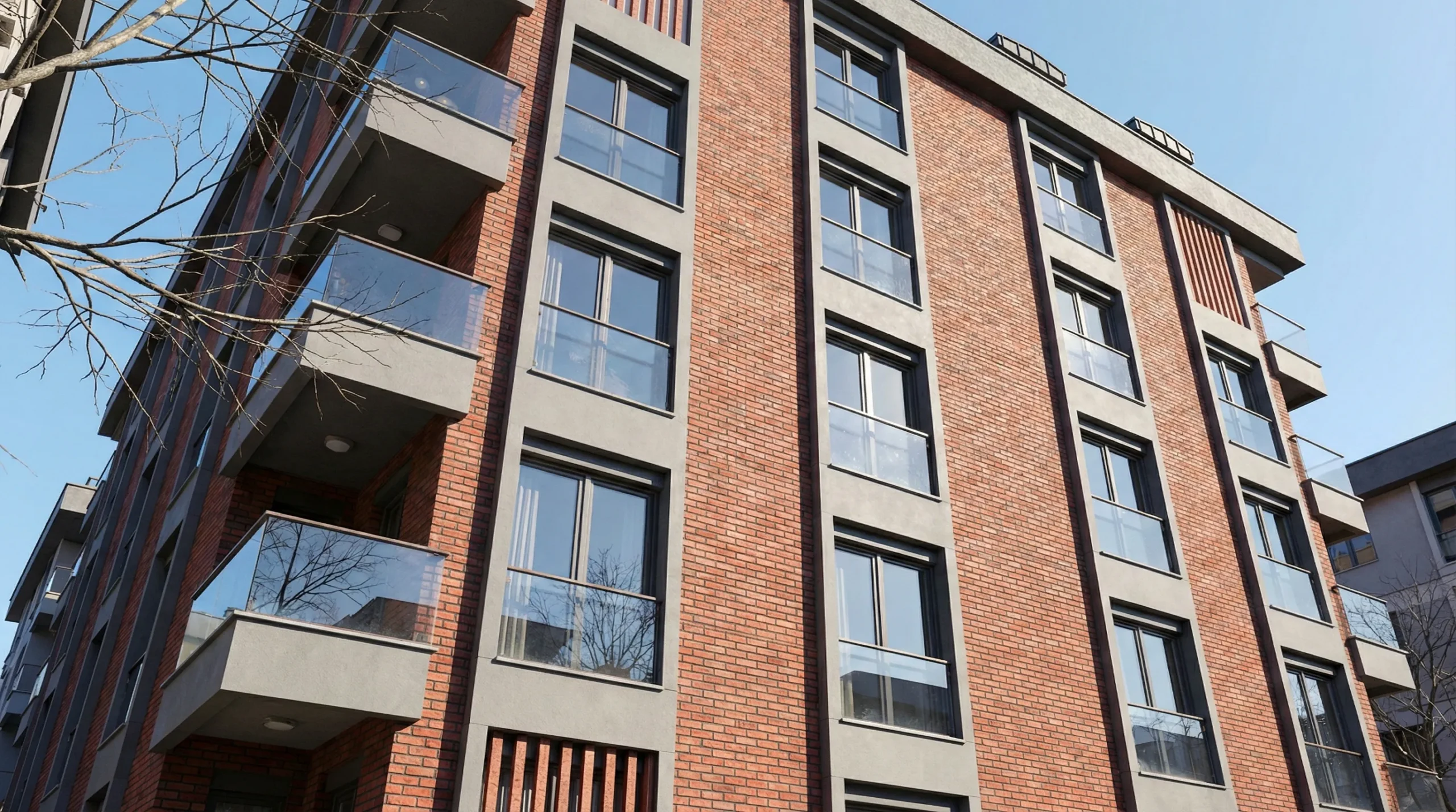 WE BLEND TIMELESS BRICK FACADES WITH MODERN ARCHITECTURAL DESIGN IN THIS 3D APARTMENT RENDERING.